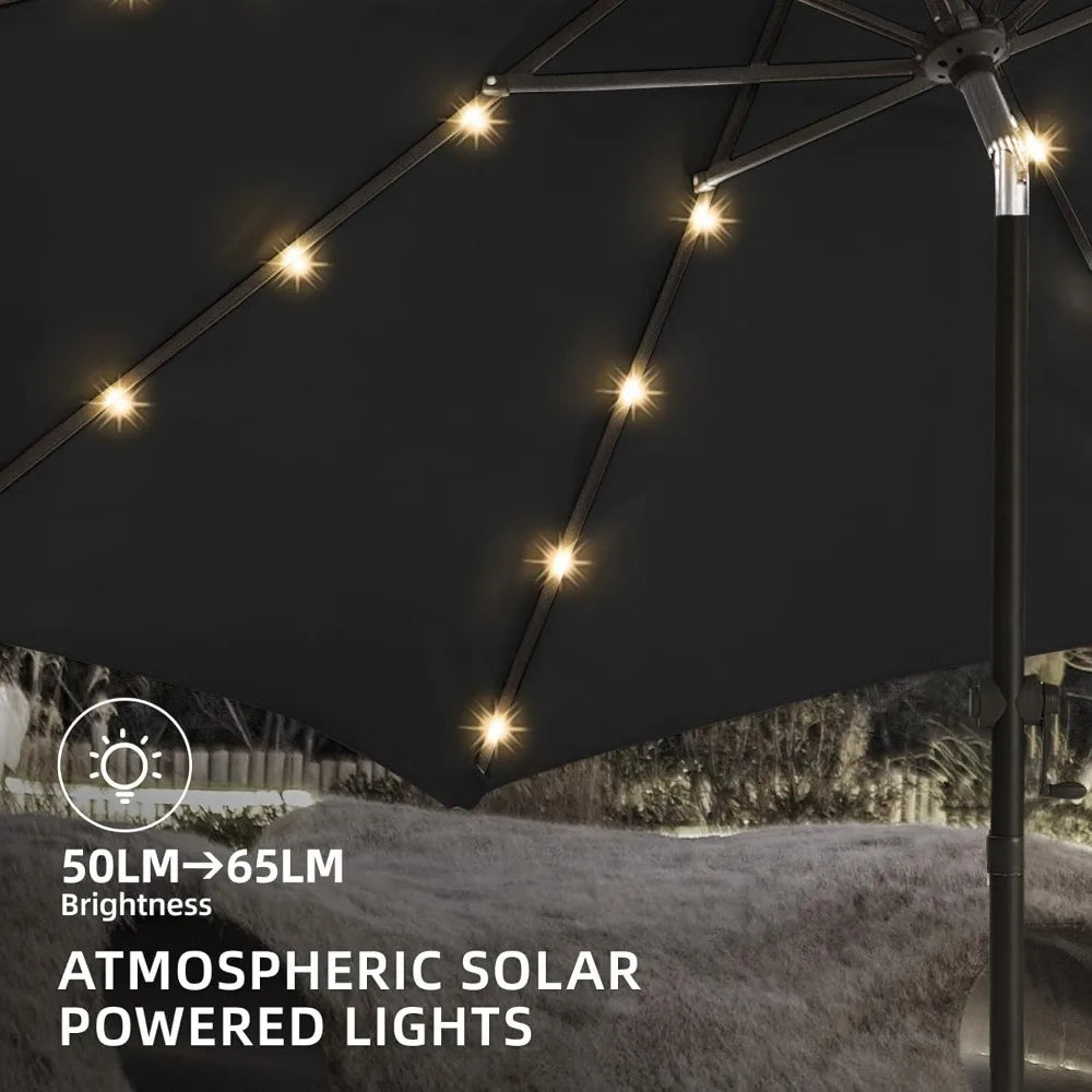 - PATIO UMBRELLA WITH BRIGHTER SOLAR LIGHTS: Our outdoor umbrella features 32 LED Lights and upgraded brightness up to 65 lms. Wikiwiki's warm lighting glows up a comfy night mood to spend leisure time with your treasures.