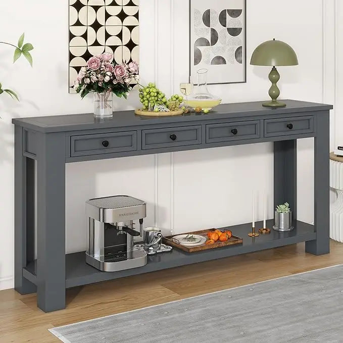 ❤LARGE STORAGE SPACE: Dimensions: 63"L× 14"W× 30"H. The console table features with 4 drawers and a fixed lower shelf and long enough tabletop which provide enough storage space.