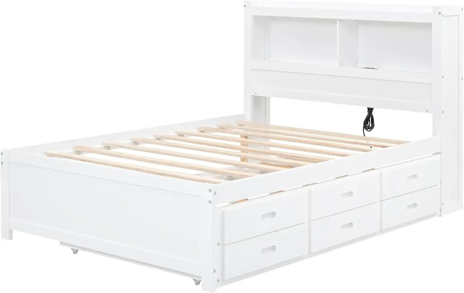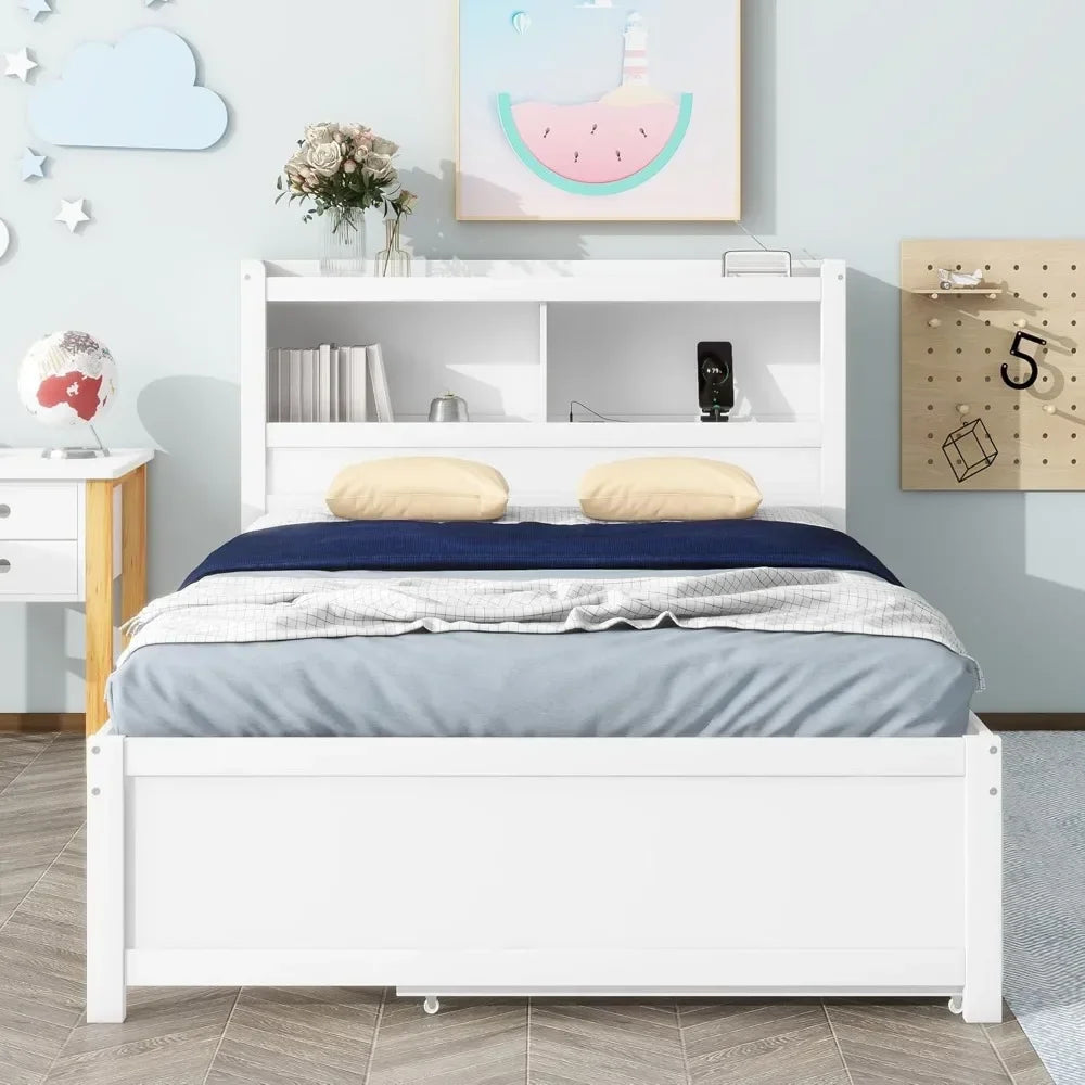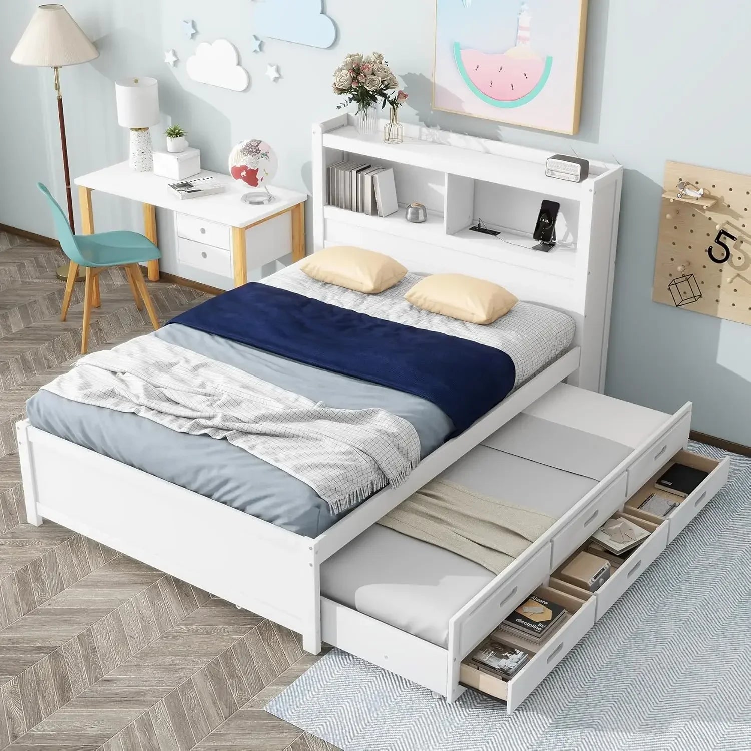 Full Platform Bed with Twin Size Trundle - Bookcase Headboard - Charging Station and 3 Drawers - Wood, Full Storage Bed Frame for Kids