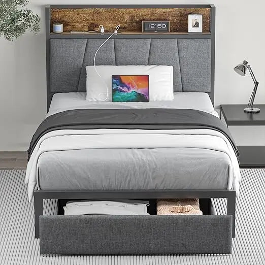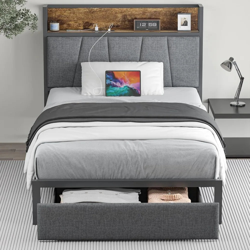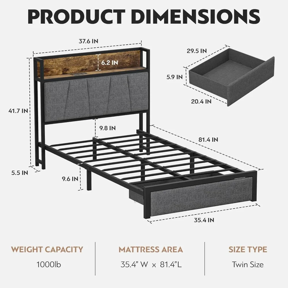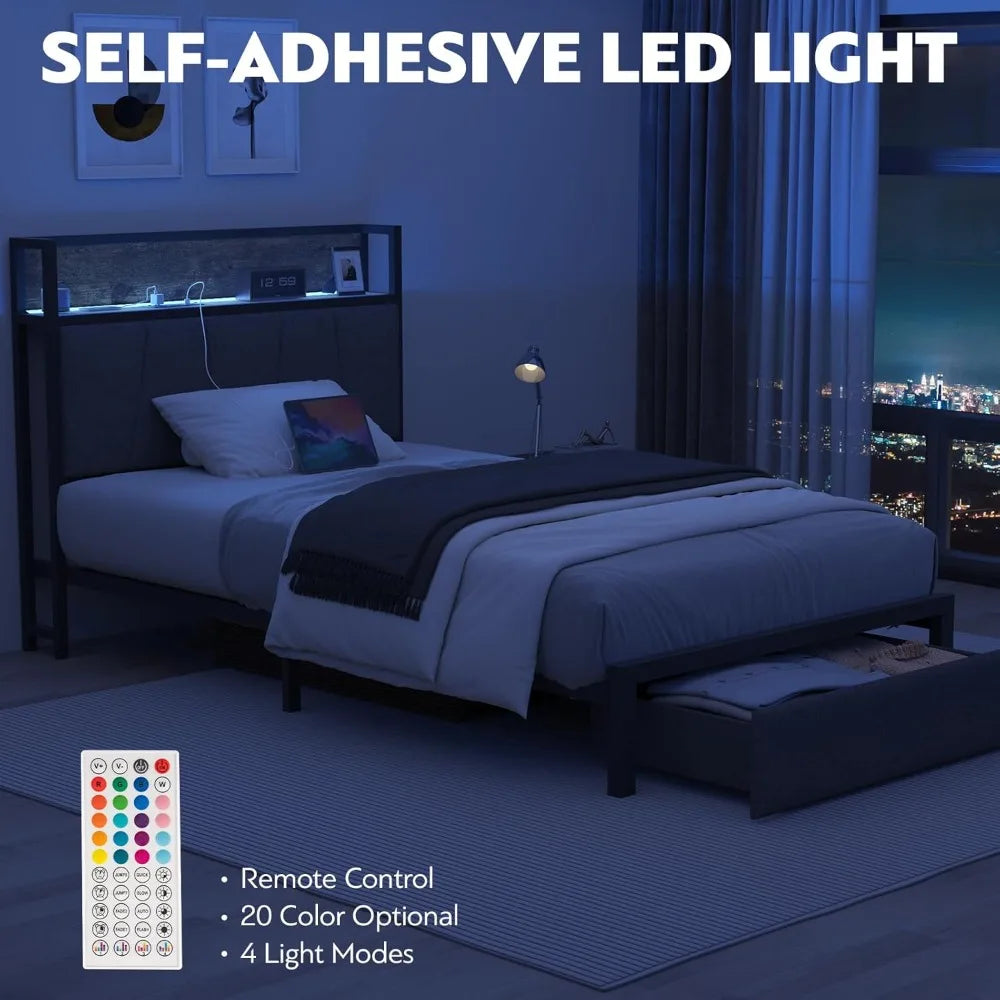Twin Size Bed Frame with Headboard and Storage - Platform Bed Frame with Drawer Storage - Charging Station & LED Light