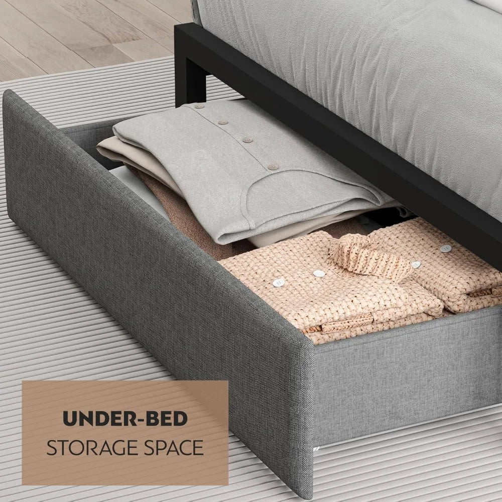 - BED WITH FABRIC STORAGE DRAWERS - This twin bed frame with drawers provides 9.8" space underneath to store shoes, boxes, and luggage. It also comes with 2 dustproof fabric drawers with wheels to put your clothes or bedding and is easy to pull out. Maximized the bed space utilization, keep your room looking tide and clean.